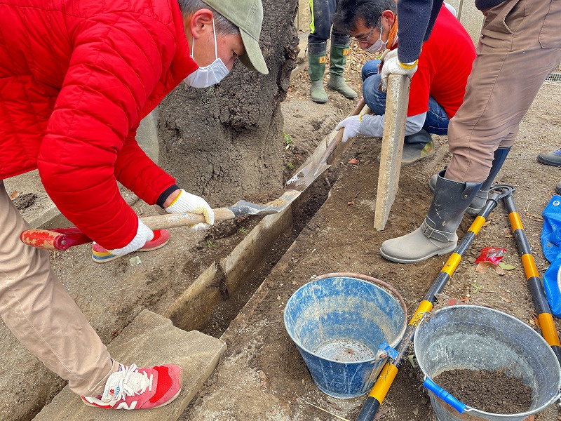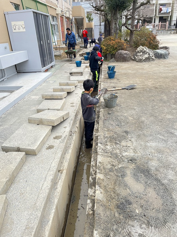 グランドの側溝にたまった土砂を取る。